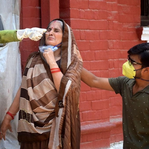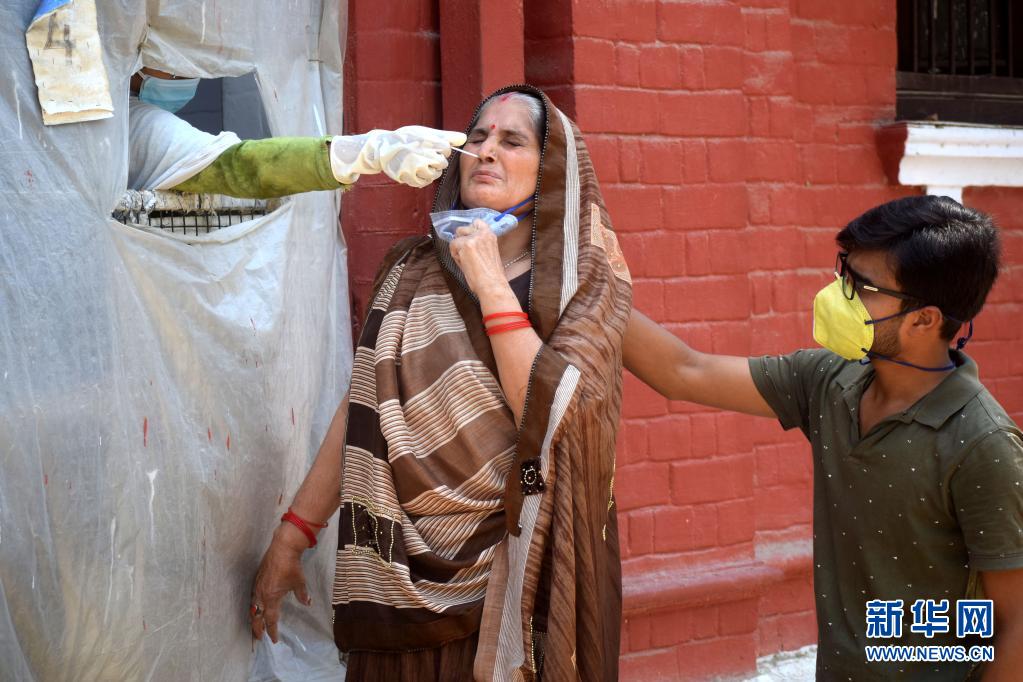 5月16日,一名女子在印度普拉亚格拉杰接受新冠病毒检测取样。