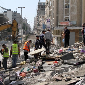 5月16日,巴勒斯坦民防人员在加沙城被炸住宅楼的废墟中进行搜救。