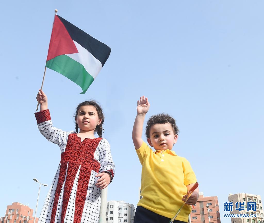 5月15日,儿童在科威特哈瓦利省参加抗议示威活动,声援巴勒斯坦民众。