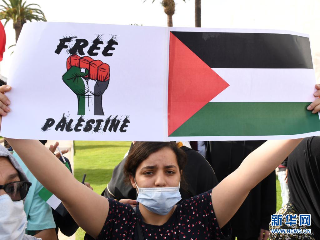 5月15日,一名女子在摩洛哥首都拉巴特参加抗议示威活动,声援巴勒斯坦民众。