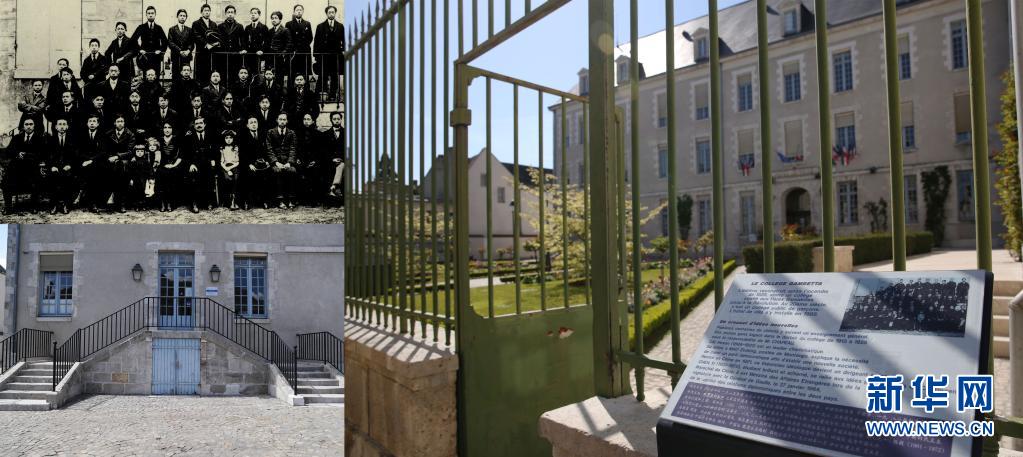 拼版照片显示的是法国蒙达尔纪男子公学。其中左上为男子公学资料照片,左下为男子公学现状(摄于2021年5月7日),右为男子公学(现为蒙达尔纪市政厅)及门前的“伟大的足迹”中法双语指示牌(摄于2021年4月8日)。1913至1925年间,几百名中国青年学生在此住宿和学习,蔡和森、陈毅等曾在此就读。