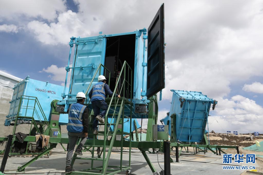 张寿山博士(前)和工人在维护高海拔宇宙线观测站广角切伦科夫望远镜阵列(2019年4月28日摄)。