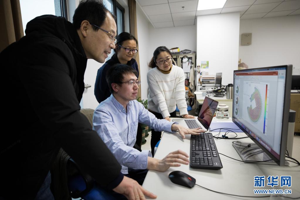 科研人员在中科院高能物理研究所办公室讨论获得的科学数据(2021年1月19日摄)。