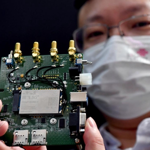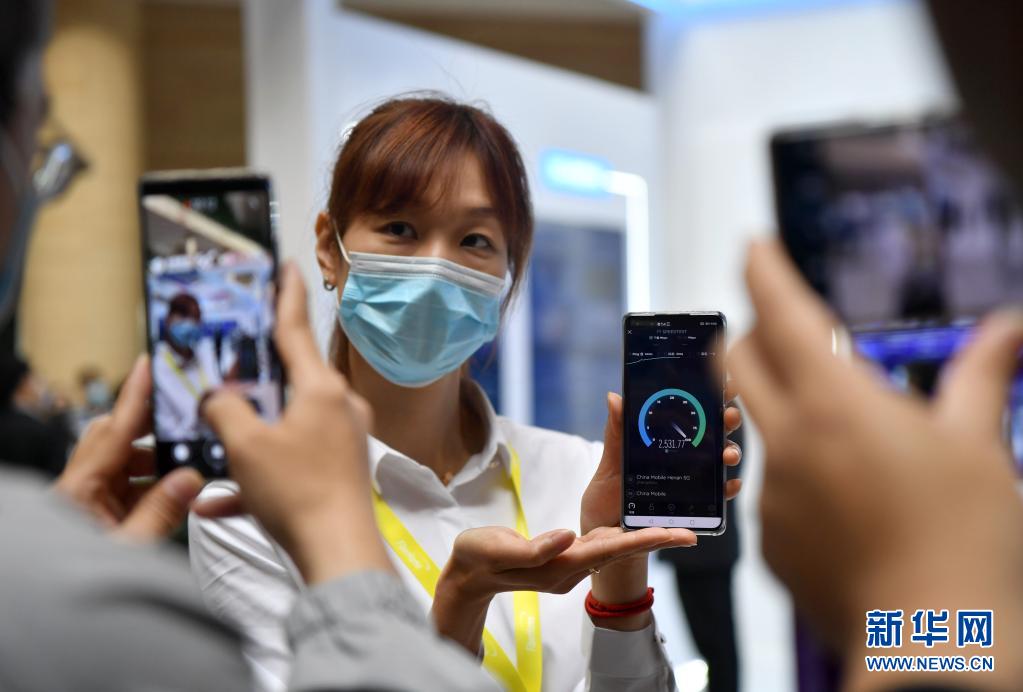 5月17日,工作人员在大会上用手机展示5G网络速度。新华社记者 李嘉南 摄