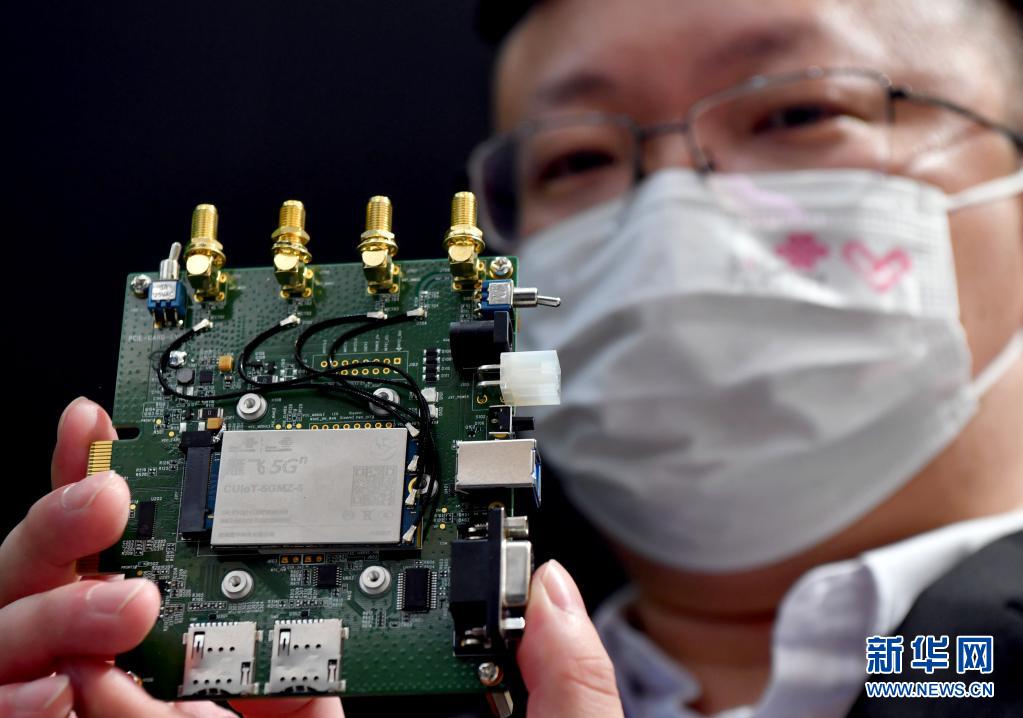 5月17日,工作人员在大会上展示“雁飞”5G模组。新华社记者 李嘉南 摄