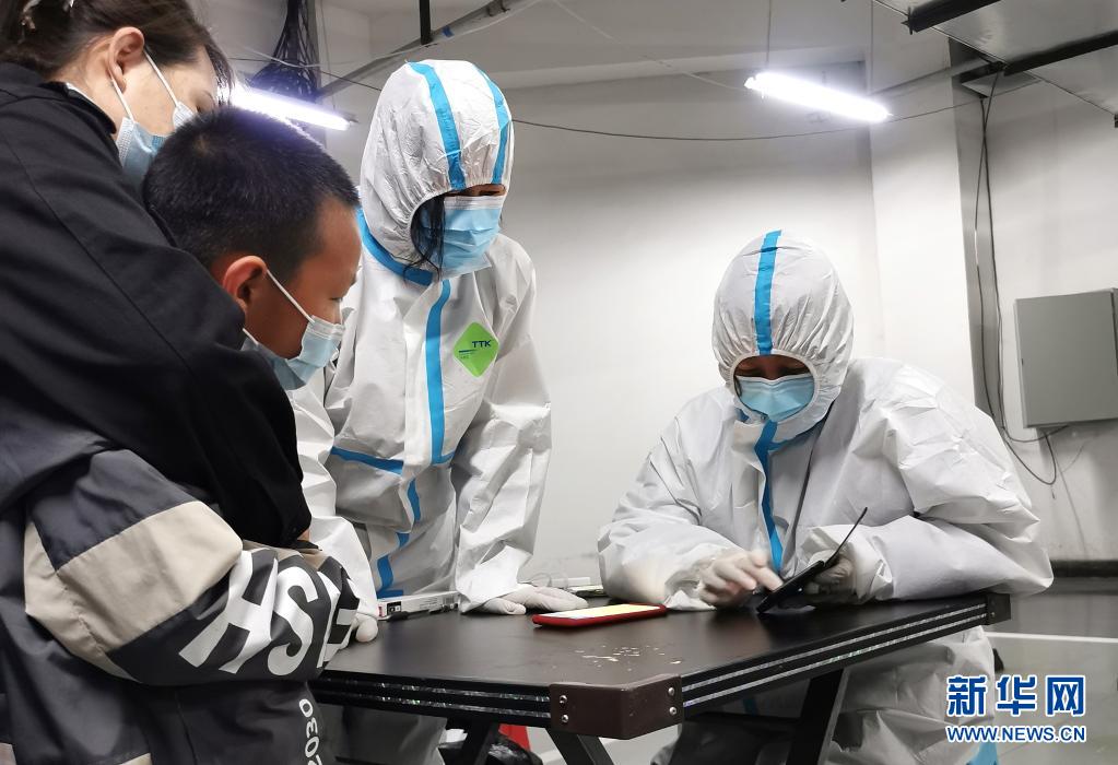 5月16日,医护人员在营口一处核酸检测点登记人员信息。