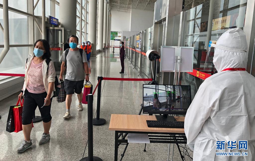 5月16日,营口兰旗机场工作人员对准备乘机的旅客进行体温监测。