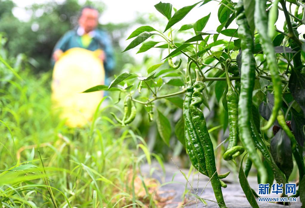 5月17日,在广西柳州市柳东新区雒容镇坭桥村,村民在地里采摘辣椒。新华社发(黎寒池 摄)