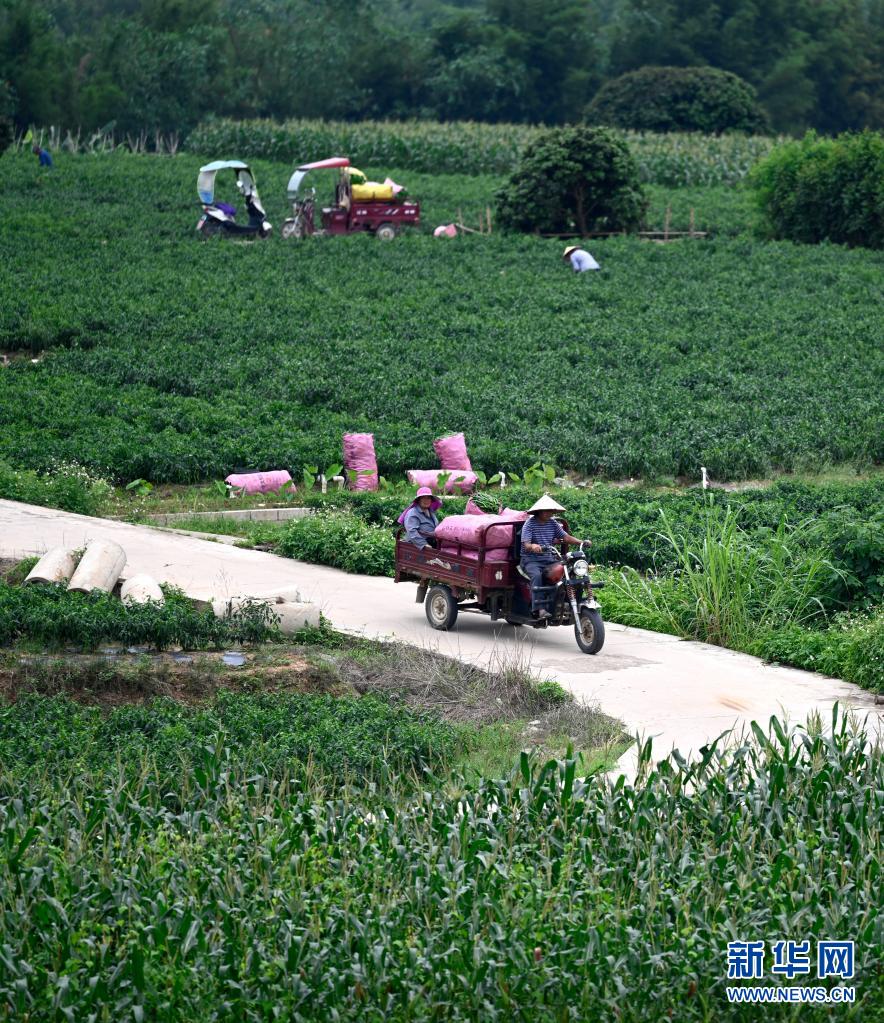 5月17日,在广西柳州市柳东新区雒容镇坭桥村,村民把刚采摘的辣椒运到收购点销售。新华社发(黎寒池 摄)