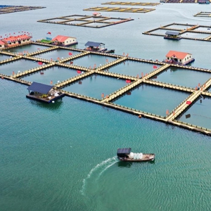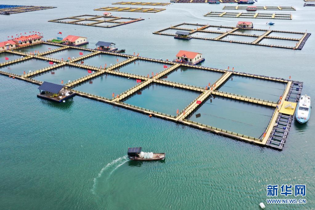 渔船驶过福建省宁德市三都澳大黄鱼养殖区(2020年7月15日摄,无人机照片)。