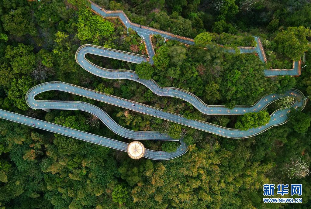 这是福州金牛山公园福道(3月16日摄,无人机照片)。采用钢架镂空设计的福道,将道路融入山地自然生态之中。