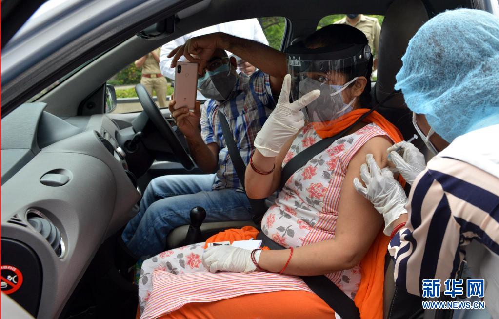 5月17日,在印度诺伊达的一个“免下车”新冠疫苗接种点,医务人员为一名女子接种疫苗。