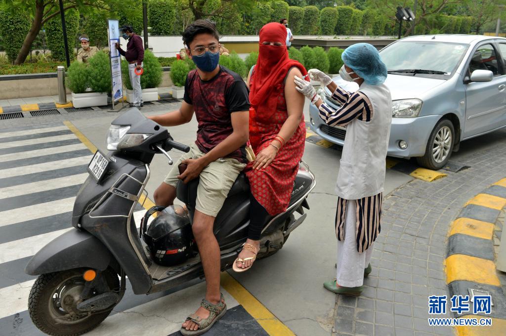 5月17日,在印度诺伊达的一个“免下车”新冠疫苗接种点,医务人员为一名女子接种疫苗。