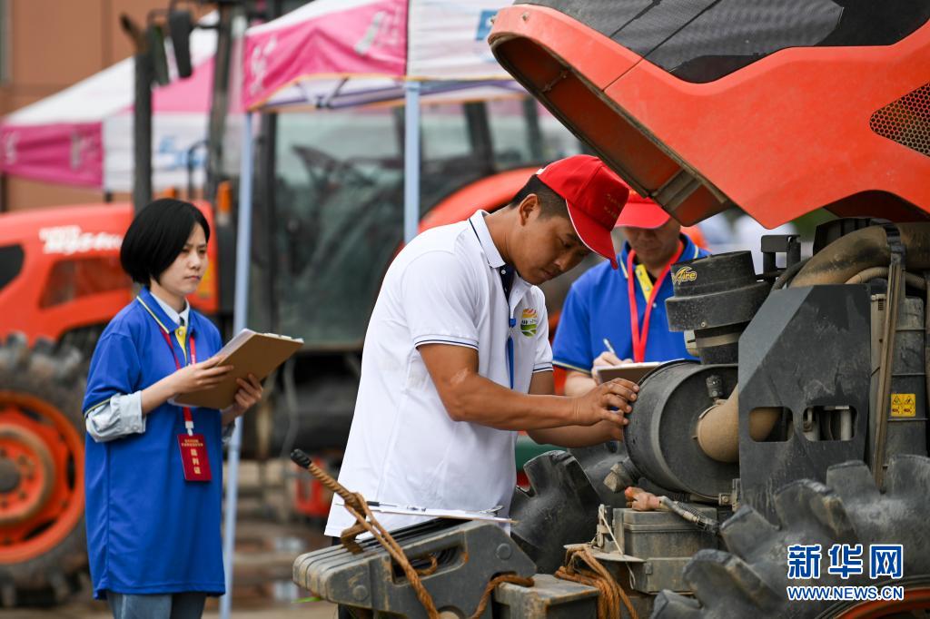 5月17日,在浙江省金华市示范性实践基地,农业职业技能竞赛选手进行拖拉机机组技术维护及常见故障诊断排除作业。新华社发(胡肖飞 摄)