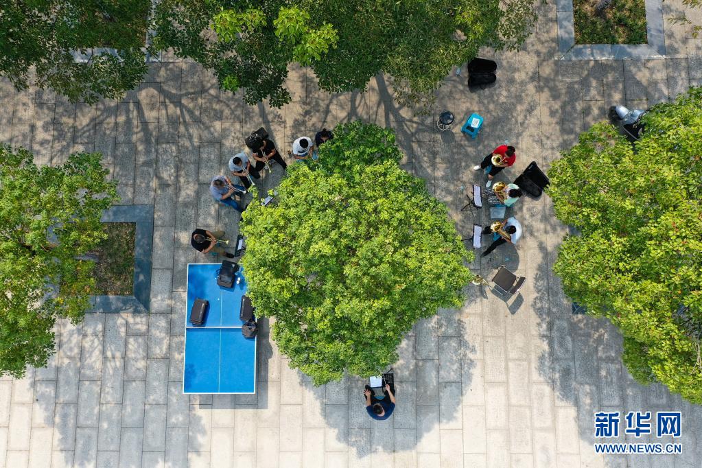 在江苏省徐州市贾汪区潘安湖街道马庄村,由村民组成的马庄村铜管乐团部分成员在排练(2020年9月8日摄,无人机照片)。新华社记者 季春鹏 摄