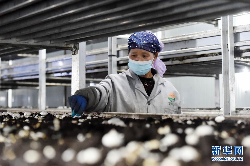 农民在宁夏银川市永宁县闽宁镇双孢菇栽培示范基地采摘蘑菇(4月21日摄)。新华社记者 唐如峰 摄