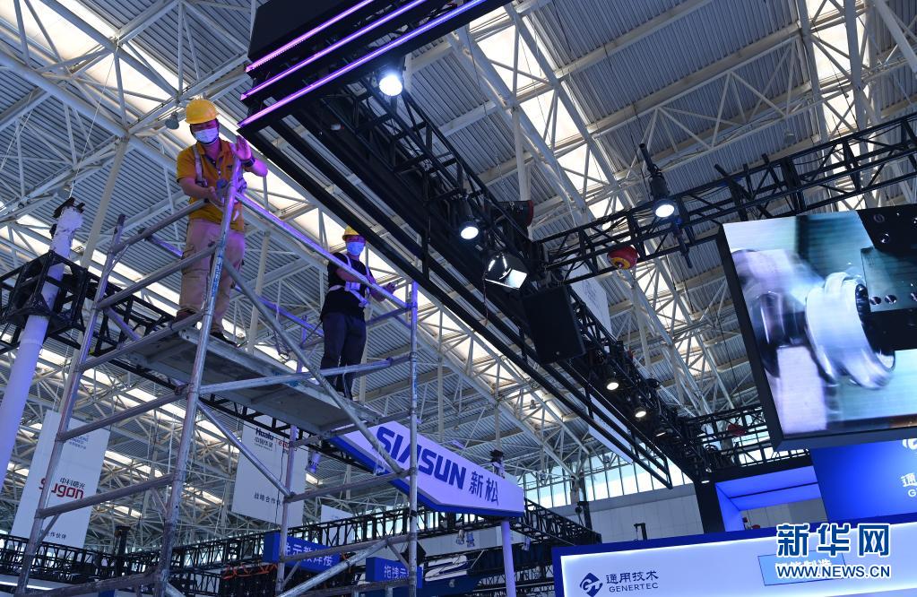5月18日,在天津梅江会展中心,工人在进行展台施工。