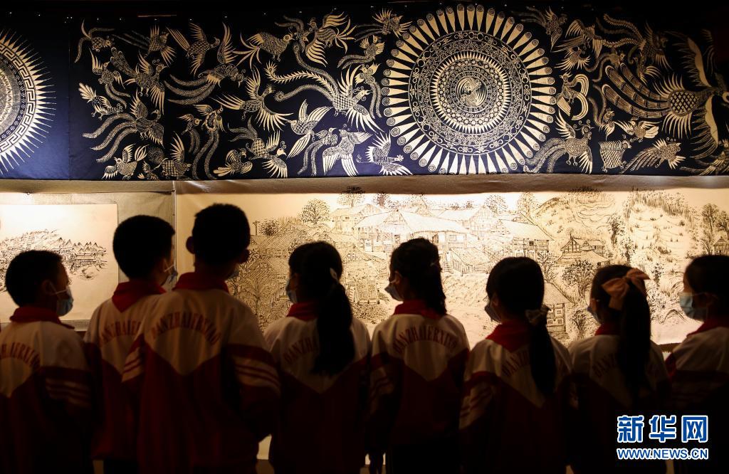5月18日,小学生在贵州丹寨县民俗博物馆参观苗族蜡染制品。