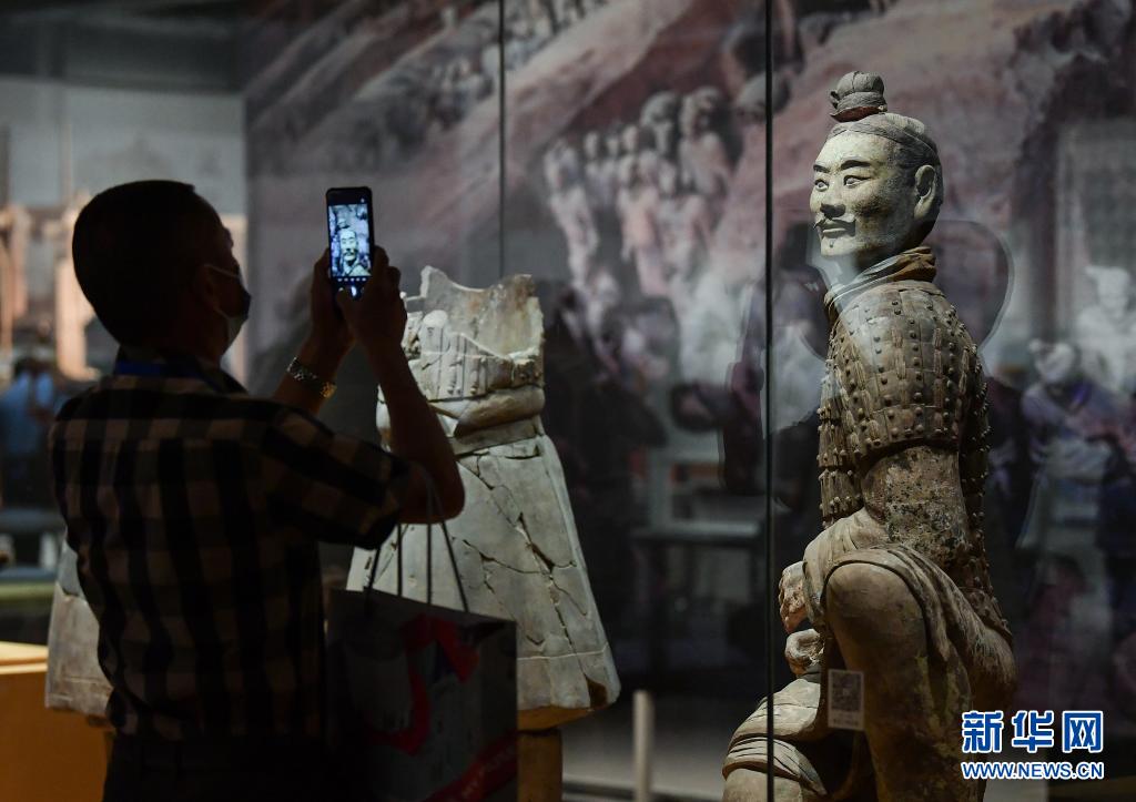 5月18日,参观者在展览现场拍摄一尊秦始皇陵兵马俑坑出土的秦俑。