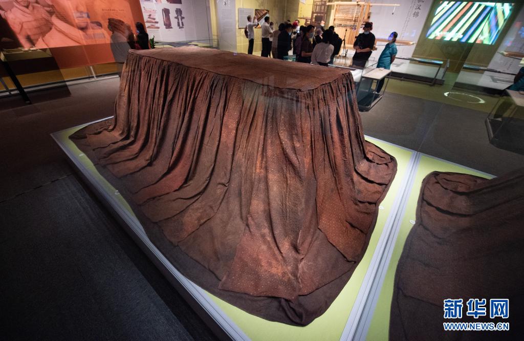 这是5月18日在“万年永宝——中国馆藏文物保护成果展”上拍摄的湖北荆州谢家桥一号汉墓出土的锦缘绢绣荒帷。