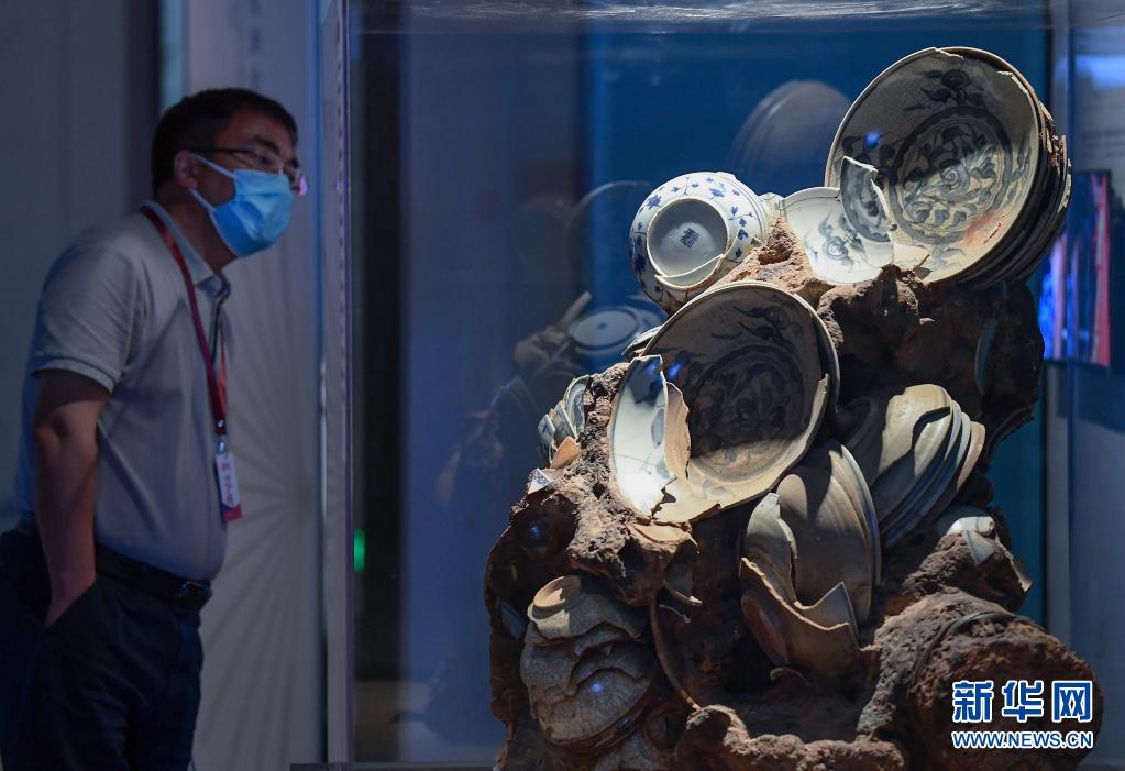 5月18日,参观者在展览现场观赏经过脱盐技术保护的南澳一号出水瓷器。