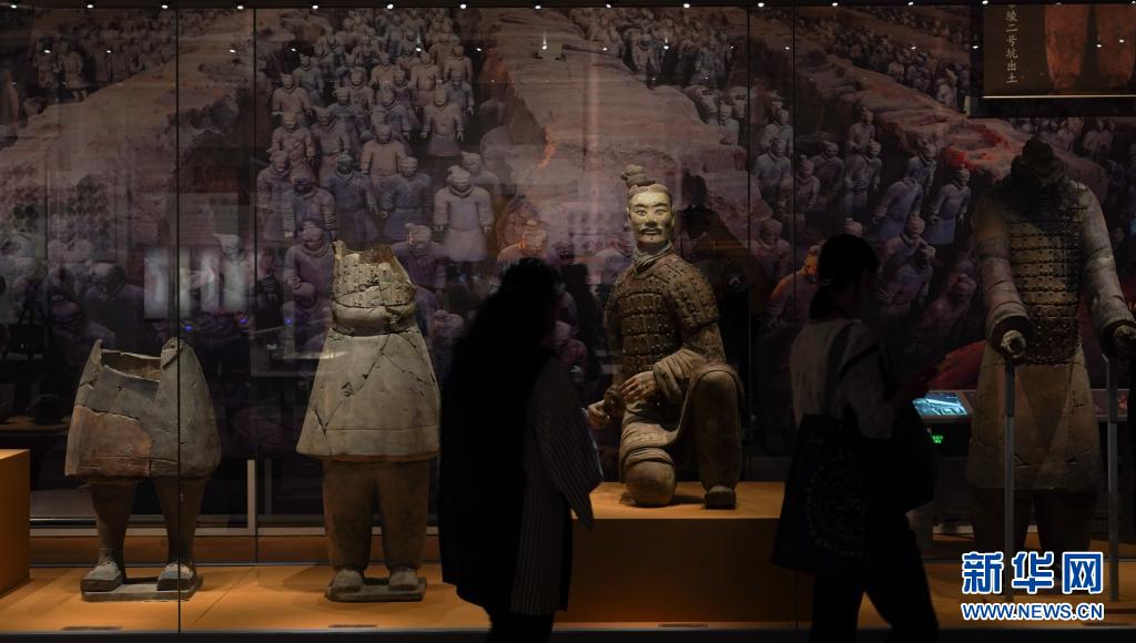 这是5月18日在“万年永宝——中国馆藏文物保护成果展”上拍摄的陕西西安秦始皇陵出土的兵马俑。