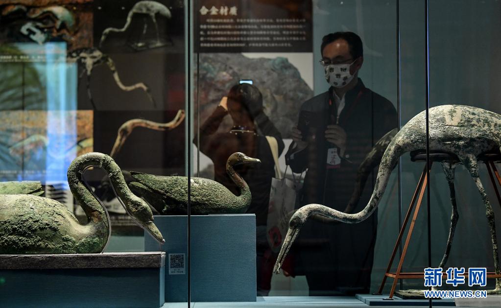 5月18日,参观者观赏一组经修复的秦始皇陵陪葬坑出土的彩绘青铜水禽。