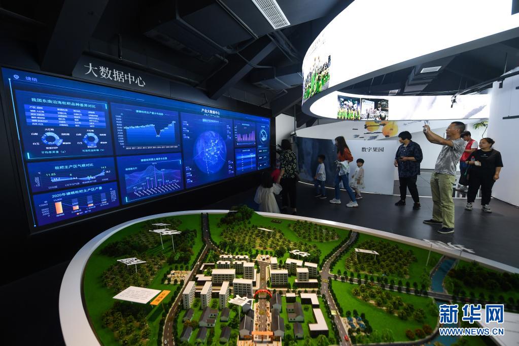 5月18日,游客在塘栖枇杷产业博览馆观看大数据数字大屏和镇区沙盘。