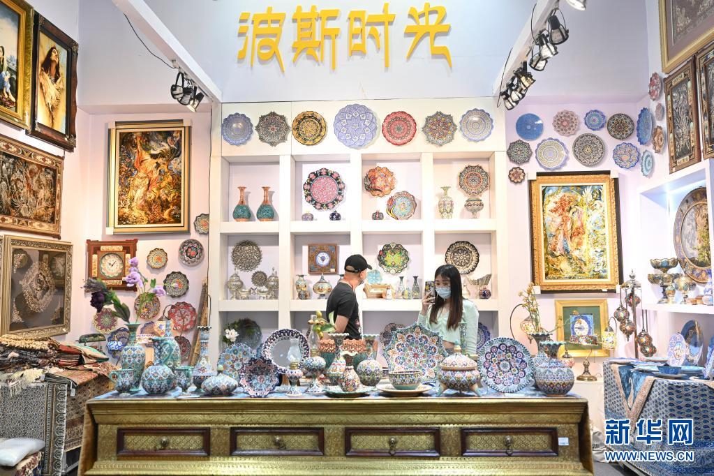 5月18日,观众在伊朗展位了解工艺品。