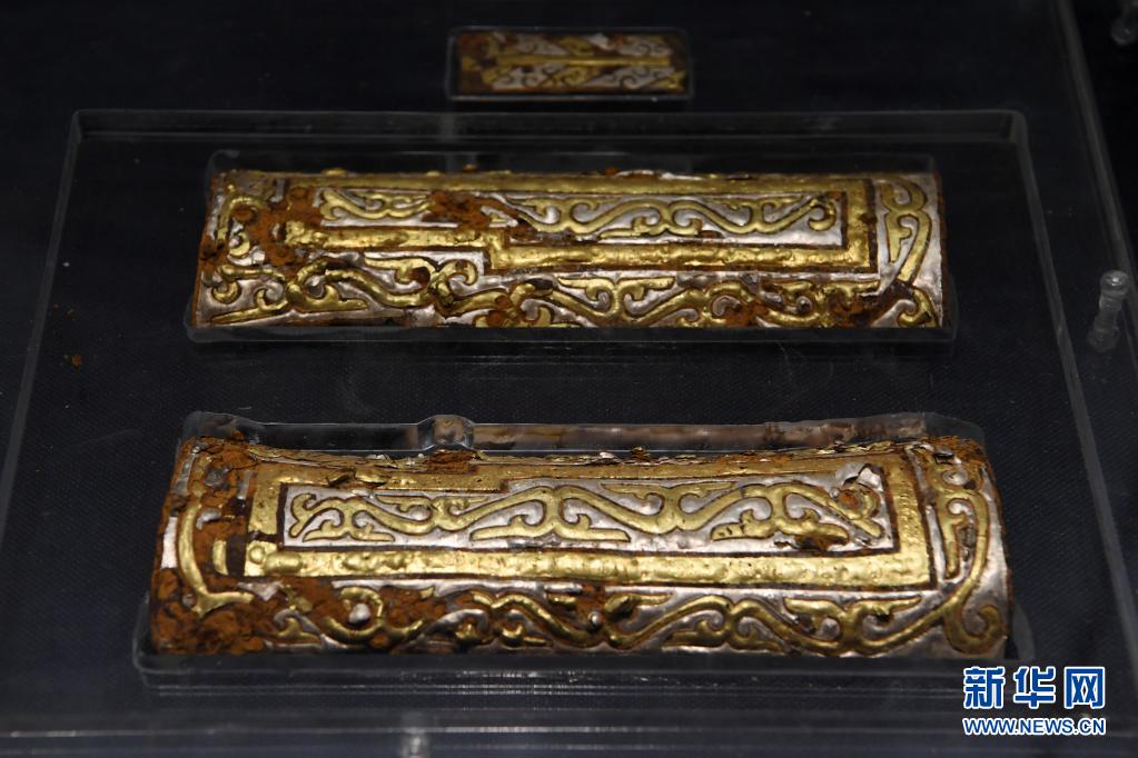 出土于马家塬西戎墓葬的铁鋄金银车后锺饰(5月18日摄)。