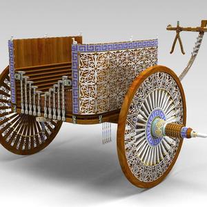 这是2010年拍摄的出土于马家塬西戎墓葬的一辆战国马车车轮及装饰。