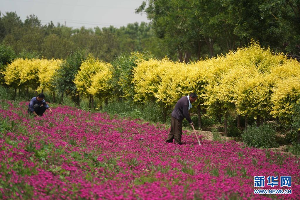 5月18日,工人在邢台市任泽区牛尾河畔打理苗木。