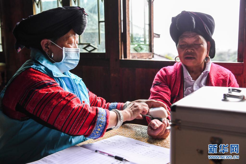 5月18日,在广西龙胜各族自治县龙脊镇小寨村,潘继萍为村民测量血压。