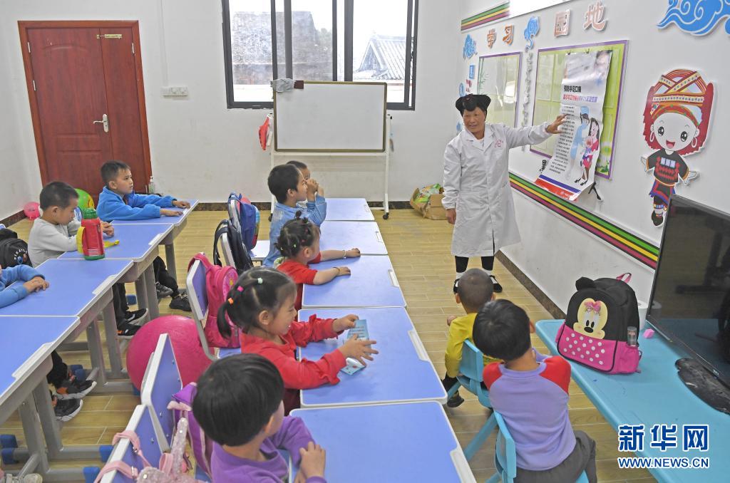 5月18日,在广西龙胜各族自治县龙脊镇小寨村,潘继萍教小朋友们如何防范手足口病。