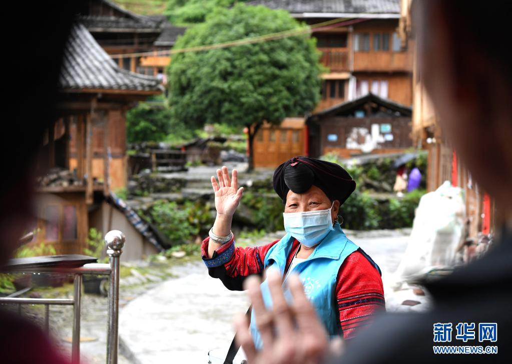 5月18日,在广西龙胜各族自治县龙脊镇小寨村,潘继萍出诊结束后和村民挥手告别。