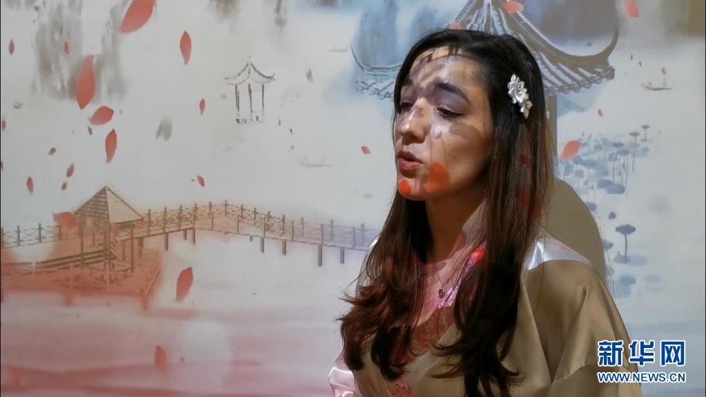 这张5月17日的视频截图显示,来自东萨拉热窝大学中文系的三年级学生安杰拉·科瓦切维奇在线表演中国歌曲。