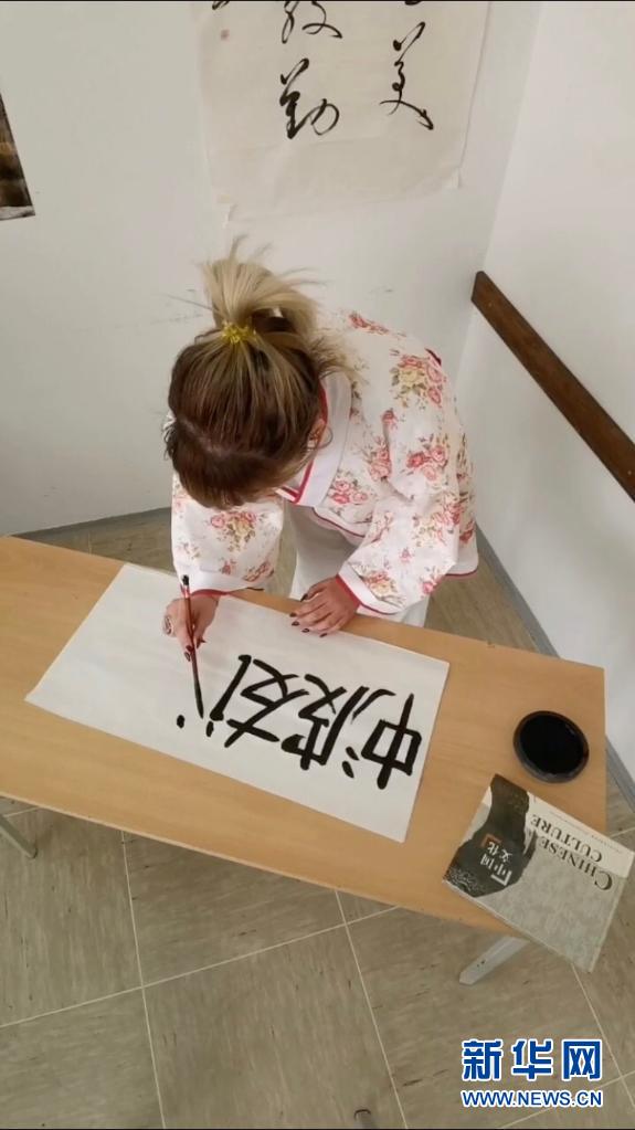 这张5月17日的视频截图显示,第20届“汉语桥”世界大学生中文比赛波黑赛区参赛者在线展示书法。