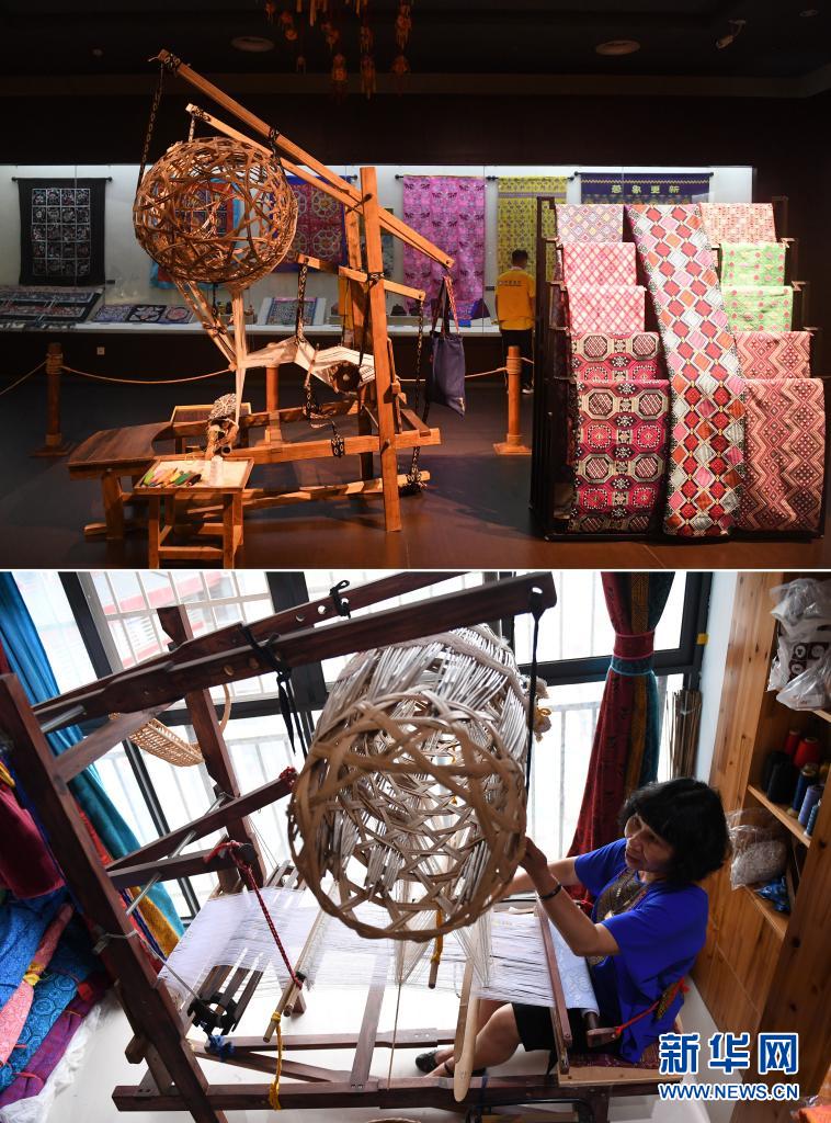 拼版照片:上图为广西民族博物馆展示的织锦机(5月18日摄);下图为中国工艺美术大师谭湘光在用织锦机织壮锦(2018年4月24日摄)。