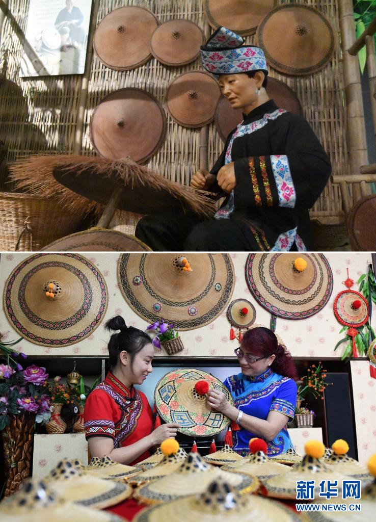 拼版照片:上图为广西民族博物馆展示的毛南族花竹帽编织场景(5月18日摄);下图为在广西环江毛南族自治县思恩镇,国家级非物质文化遗产代表性项目(毛南族花竹帽编织技艺)代表性传承人谭素娟(右)在家中向女儿覃敏传授花竹帽编织技艺(2018年7月26日摄)。