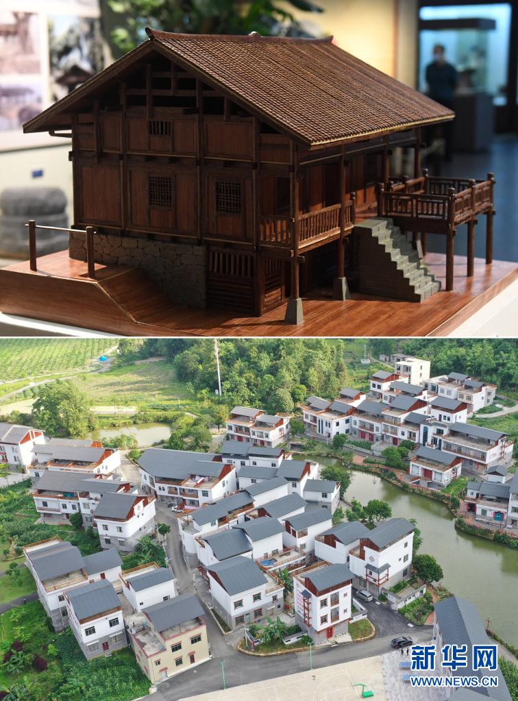 拼版照片:上图为广西民族博物馆展示的壮族民居模型(5月18日摄);下图为广西百色市田阳区五村镇巴某村壮族民居(无人机照片,2020年6月4日摄)。