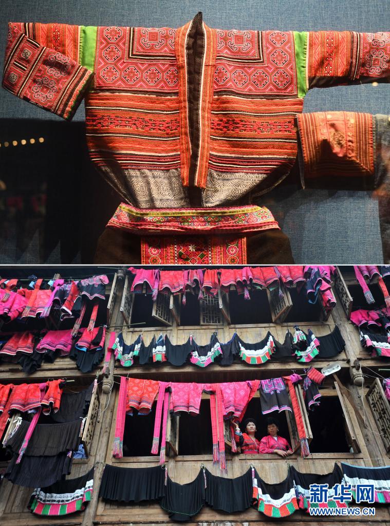 拼版照片:上图为广西民族博物馆展示的一件红瑶服饰(5月18日摄);下图为在广西龙胜各族自治县龙脊镇金坑瑶寨,当地瑶族同胞在红瑶“晒衣节”上晾晒的瑶族服饰(2014年7月2日摄)。