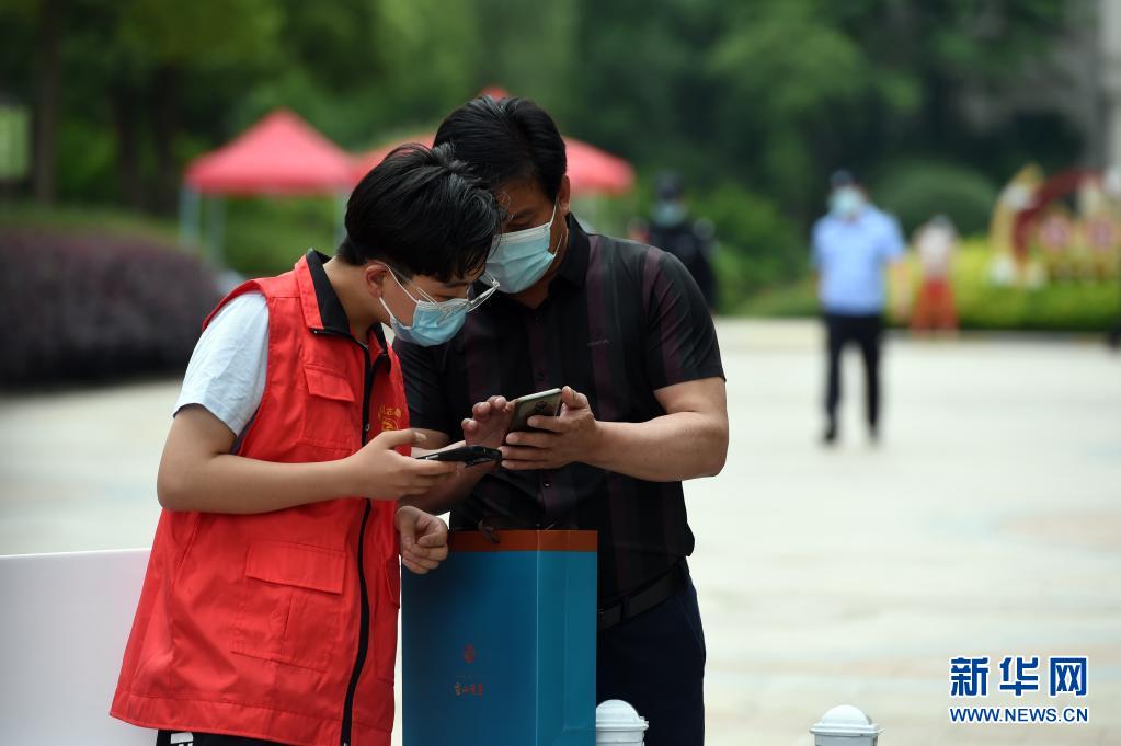 5月18日,在封闭管控的中风险区六安市恒大御景湾小区,工作人员(左)在登记小区居民的购物需求。