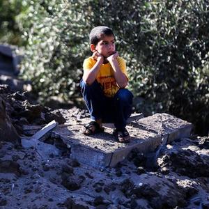5月18日,在加沙地带城市汗尤尼斯,一名巴勒斯坦儿童蹲在被以军空袭摧毁的一处房屋废墟中。