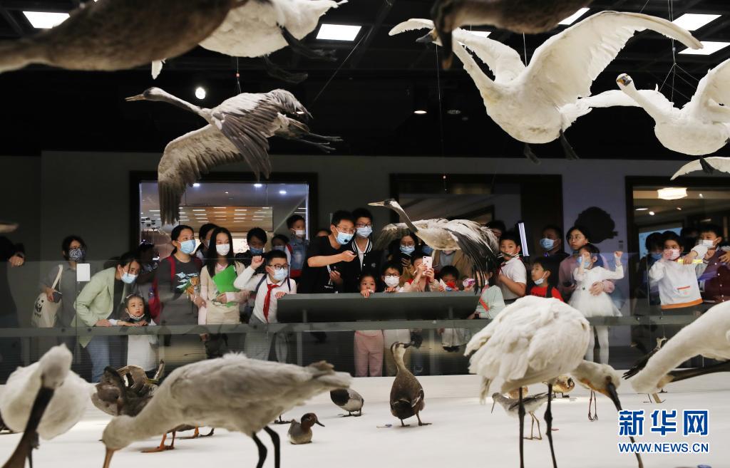 5月18日,观众在鸟类展区听讲解员介绍不同鸟类的特点和习性。