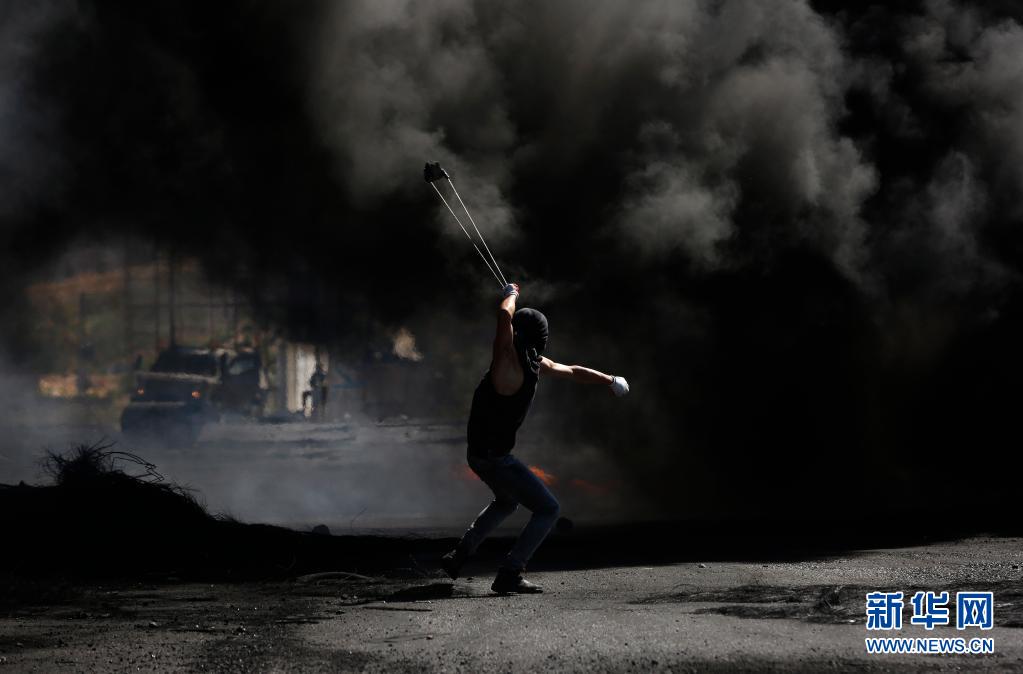 5月18日,一名巴勒斯坦示威者在约旦河西岸城市纳布卢斯附近的冲突中向以色列士兵投掷石块。