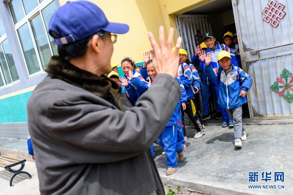 5月4日,在西藏昌都市类乌齐县长毛岭乡第一小学,学生们向李纯民道别。新华社记者 刘金海 摄