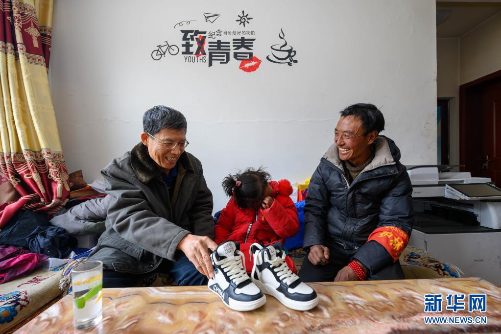 5月3日,在西藏昌都市类乌齐县伊日乡小学,扎西措姆(中)在父亲帕巴泽仁(右)的陪伴下,接受李纯民(左)赠予的一双为她专门定制的新鞋。扎西措姆自幼患有足部残疾,穿普通鞋子无法舒适行走。2020年,李纯民个人出资为扎西措姆定制了一双鞋。不久前,得知扎西措姆的鞋子穿破后,李纯民再次为她定制了一双新鞋。新华社记者 刘金海 摄