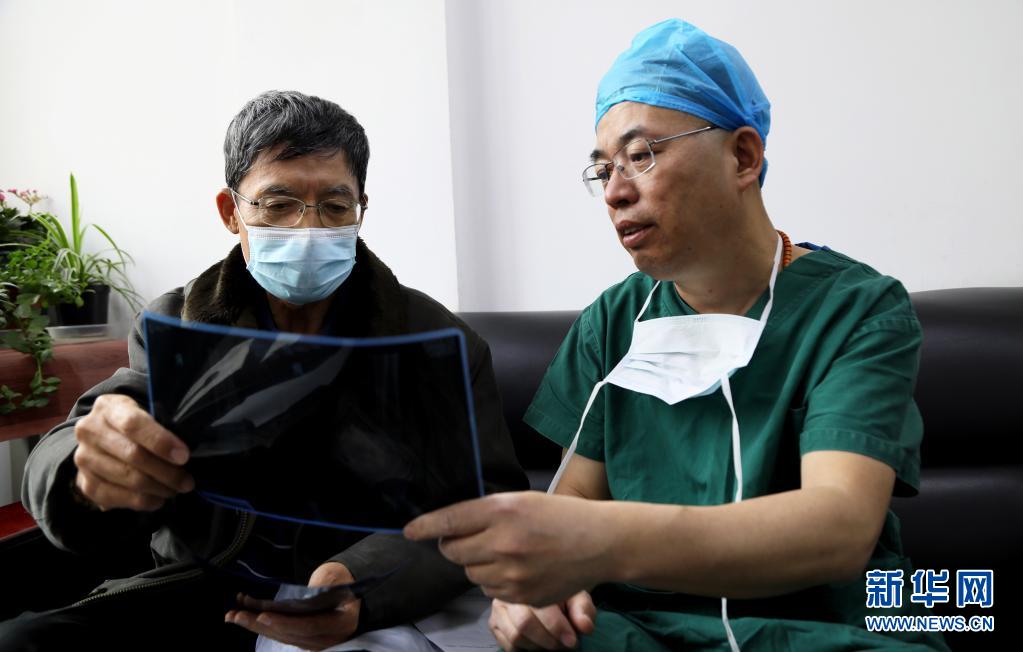 5月12日,李纯民(左)与西藏昌都市藏医院骨科天津援藏的李明新主任查看右脚残疾女童扎西措姆的X光片。新华社记者 普布扎西 摄