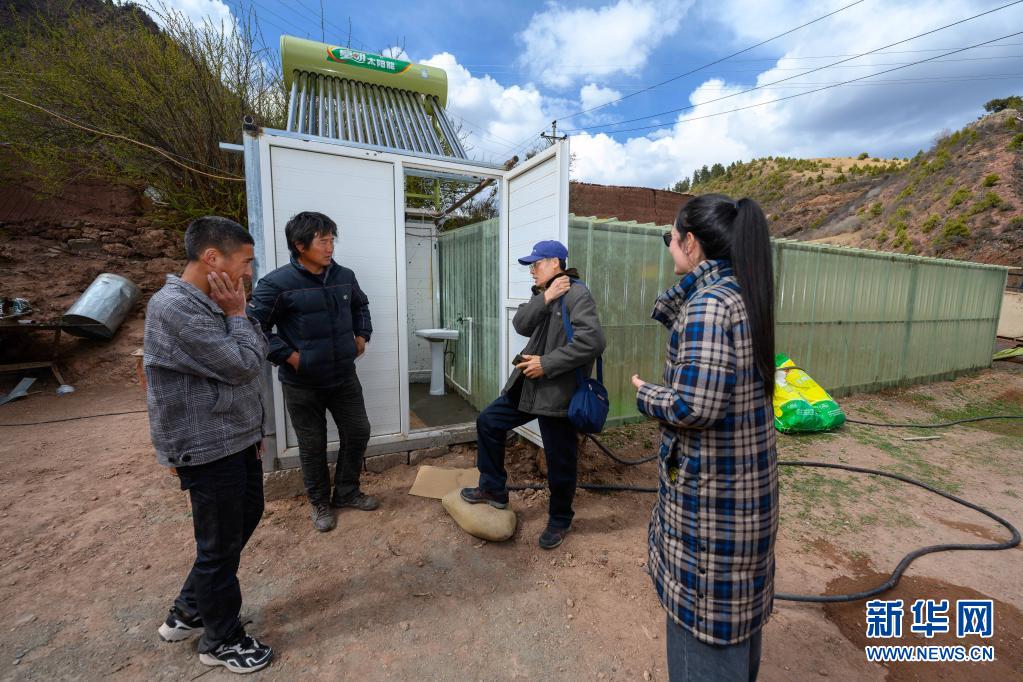 5月2日,李纯民赶到西藏昌都市类乌齐县滨达乡滨达村,为当地村民向巴巴登协调太阳能热水器的安装调试工作。这是李纯民(右二)通过滨达乡小学老师索朗卓玛(右一)作藏语翻译,就热水淋浴室与水冲厕整体改造计划给向巴巴登(左二)提出建议。新华社记者 刘金海 摄