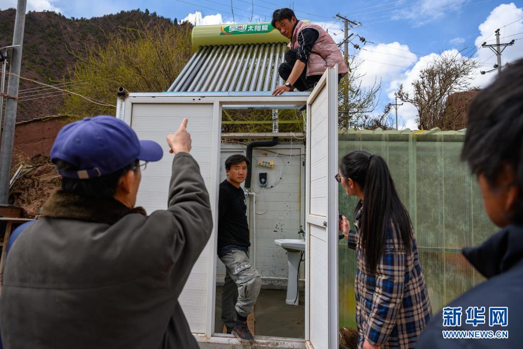 5月2日,李纯民赶到西藏昌都市类乌齐县滨达乡滨达村,为当地村民向巴巴登协调太阳能热水器的安装调试工作。这是李纯民(左一)与太阳能热水器厂家技术人员协商太阳能热水器安装调试方案。新华社记者 刘金海 摄